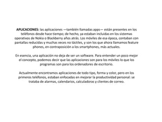 Este documento habla sobre las aplicaciones móviles. Explica que las aplicaciones han estado presentes en teléfonos desde hace tiempo a través de sistemas operativos como Nokia y Blackberry. Originalmente, las aplicaciones se enfocaban en mejorar la productividad personal a través de alarmas, calendarios, calculadoras y clientes de correo debido a las limitaciones tecnológicas de los teléfonos de la época. Actualmente encontramos aplicaciones de todo tipo que cumplen funciones más allá de la productividad personal.