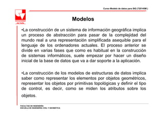 Este documento presenta los conceptos básicos de los modelos de datos para sistemas de información geográfica. Explica que los modelos implican una abstracción de la realidad para representarla en una base de datos. Describe los modelos vectorial y raster, indicando que el vectorial representa objetos discretos mediante puntos, líneas y polígonos mientras que el raster usa una cuadrícula regular.