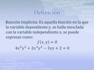 Este documento describe cómo derivar implícitamente de forma concisa. Explica que la derivada siempre es negativa debido a la transposición de términos. Propone un procedimiento corto donde los términos no asociados a y' van directamente al numerador y los asociados a y' van directamente al denominador. Finalmente, señala que la derivada puede hacerse directamente colocando los términos no asociados a y' en el numerador y los asociados a y' en el denominador.