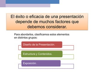 El documento proporciona consejos para lograr una presentación digital efectiva. Explica que el éxito de una presentación depende del diseño, la estructura y los contenidos, y de la forma de exposición. Recomienda prestar atención al tipo y tamaño de letra, los fondos, las imágenes y limitarse a dos o tres fuentes. Además, sugiere definir los temas, ordenarlos por importancia y usar esquemas y ejemplos. Finalmente, enfatiza la interacción con la audiencia y evitar leer diapositivas