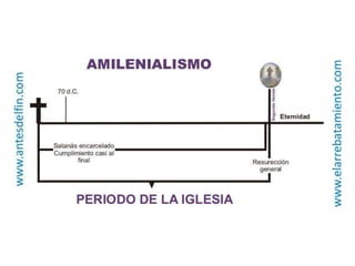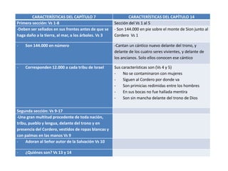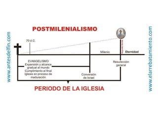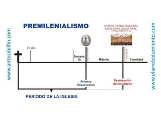 El documento compara las características de los capítulos 7 y 14 de Apocalipsis, y resume tres posiciones teológicas sobre el milenio mencionado en Apocalipsis 20: premilenarismo, postmilenarismo y amilenarismo. También describe las características del premilenarismo dispensacionalista.