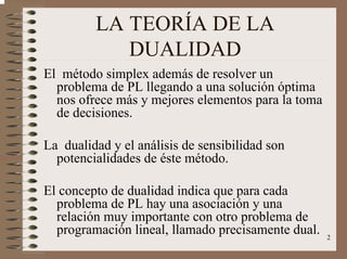 Este documento describe la relación entre un problema de programación lineal primal y su correspondiente problema dual. Explica que para cada problema primal existe un problema dual asociado, y describe los pasos para convertir un problema primal en su forma dual. También incluye ejemplos numéricos que ilustran la conversión de un problema primal a su forma dual.