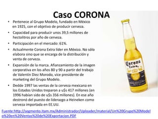 Corona es una cerveza mexicana producida por el Grupo Modelo desde 1925. Actualmente tiene una participación del 61% en el mercado mexicano y es la cerveza importada más vendida en Estados Unidos. A lo largo de las décadas, Corona ha fortalecido su marca a nivel global a través de campañas de marketing asociadas con la playa, el sol y un estilo de vida relajado y divertido.