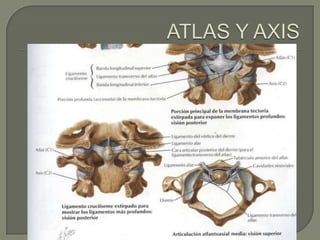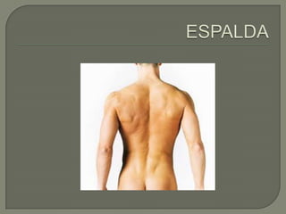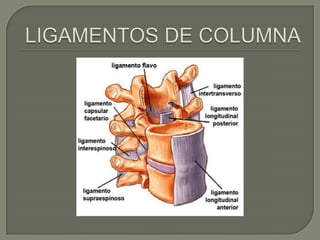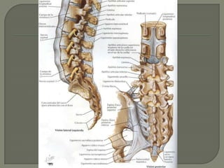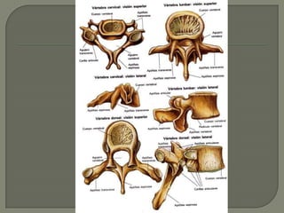 La columna vertebral está constituida por 33 segmentos óseos llamados vertebras. Se divide en regiones como cervical, torácica, lumbar, sacra y cóccix. Cada vertebra posee un cuerpo, arco vertebral y apófisis. Los discos intervertebrales actúan como amortiguadores entre los cuerpos vertebrales. Existen articulaciones entre los cuerpos, arcos y apófisis vertebrales. La columna presenta curvaturas sagitales y está involucrada en músculos del cuello, espalda y nuca.