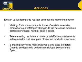 El documento resume las principales formas y objetivos del marketing directo. Describe estrategias como el mailing, telemarketing y e-mailing, cuyo objetivo es llegar directamente a los clientes potenciales de forma rápida y económica. También destaca la importancia de medir la efectividad a través de la tasa de respuesta y el coste por pedido. Finalmente, presenta los siete pasos clave para una buena estrategia de marketing directo, como la segmentación de clientes y anticiparse a sus necesidades futuras.