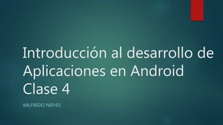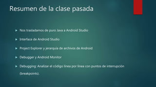 Este documento resume la clase 4 de una introducción al desarrollo de aplicaciones en Android. Se discute el ciclo de vida de las actividades, cómo extender una aplicación a múltiples actividades usando intents, y la importancia de la validación de datos de entrada. También se mencionan listas y diálogos como elementos para presentar información a los usuarios.
