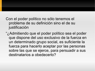 El documento discute los problemas de definir y justificar el poder político. Se plantea si el poder político puede basarse únicamente en la fuerza o si requiere legitimidad. A lo largo de la historia, se ha distinguido entre poder político legítimo e ilegítimo, como entre reyes y tiranos. Se han propuesto varios criterios para justificar el poder político, como la autoridad divina, la voluntad del pueblo, la naturaleza o la tradición histórica.