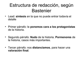 El documento describe la estructura de redacción según Miguel Ángel Bastenier, que incluye un lead o síntesis inicial, un primer párrafo presentando a los protagonistas, un segundo párrafo con detalles importantes, y un tercer párrafo de valoración final. También discute las reflexiones de estudiantes sobre el periodismo digital, incluyendo que los lectores ahora participan e interactúan, y que los textos se enriquecen con imágenes, videos e hipervínculos.