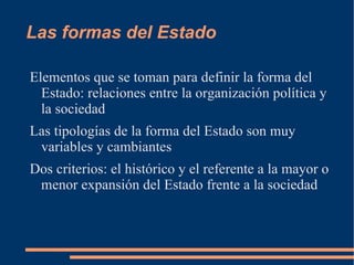 El documento describe las diferentes formas de Estado, incluyendo los estados feudales, estamentales y representativos. Explica que los estados estamentales se caracterizan por la representación de grupos como la nobleza, el clero y la burguesía, mientras que los estados representativos reconocen los derechos políticos de los individuos. También discute la transición del estado estamental al estado absoluto y luego al estado representativo a medida que se ampliaron los derechos políticos.