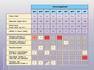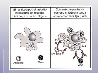 Las inmunoglobulinas (Ig) son proteínas producidas por el sistema inmune en respuesta a antígenos. Existen cinco isotipos principales de Ig: IgA, IgD, IgE, IgG e IgM. Cada isotipo tiene características y funciones diferentes como la activación del complemento, unión a células, opsonización de patógenos, y defensa frente a infecciones. Las regiones variables de las Ig les permiten unirse de forma específica a un amplio rango de antígenos, mientras que las regiones constantes determinan las