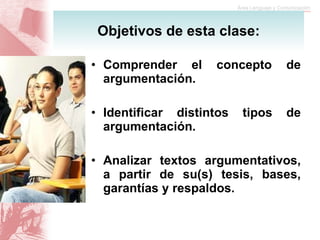 Este documento presenta los conceptos clave de la argumentación y la estructura de un discurso argumentativo. Explica que la argumentación busca convencer o persuadir al receptor sobre la validez de una afirmación. Describe los elementos de la estructura como la tesis, bases, garantías y respaldos. También define diferentes tipos de argumentación y recursos verbales y no verbales utilizados para persuadir al público. Finalmente, proporciona ejemplos de argumentación en la publicidad y el lenguaje jurídico.