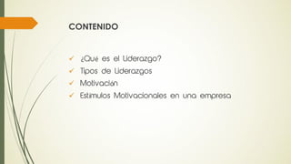 Este documento discute el concepto de liderazgo y tipos de liderazgo. Define el liderazgo como la forma de organizar el trabajo de un grupo alrededor de una visión compartida para lograr metas a través de la dirección, orientación y resolución de problemas. Luego describe tres tipos de liderazgo - carismático, tradicional y legítimo - y siete tipos según otro autor. También explica que la motivación es clave para el éxito organizacional y que los líderes deben saber motivar a sus equipos.