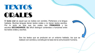 Este documento describe las características de los textos orales. Explica que los textos orales son primarios y se producen de forma espontánea a través del habla. Se caracterizan por la comunicación no verbal, la espontaneidad, la sintaxis poco elaborada y la abundancia de deícticos. Además, clasifica los textos orales en tres tipos según la situación comunicativa: singular, dual y plural.