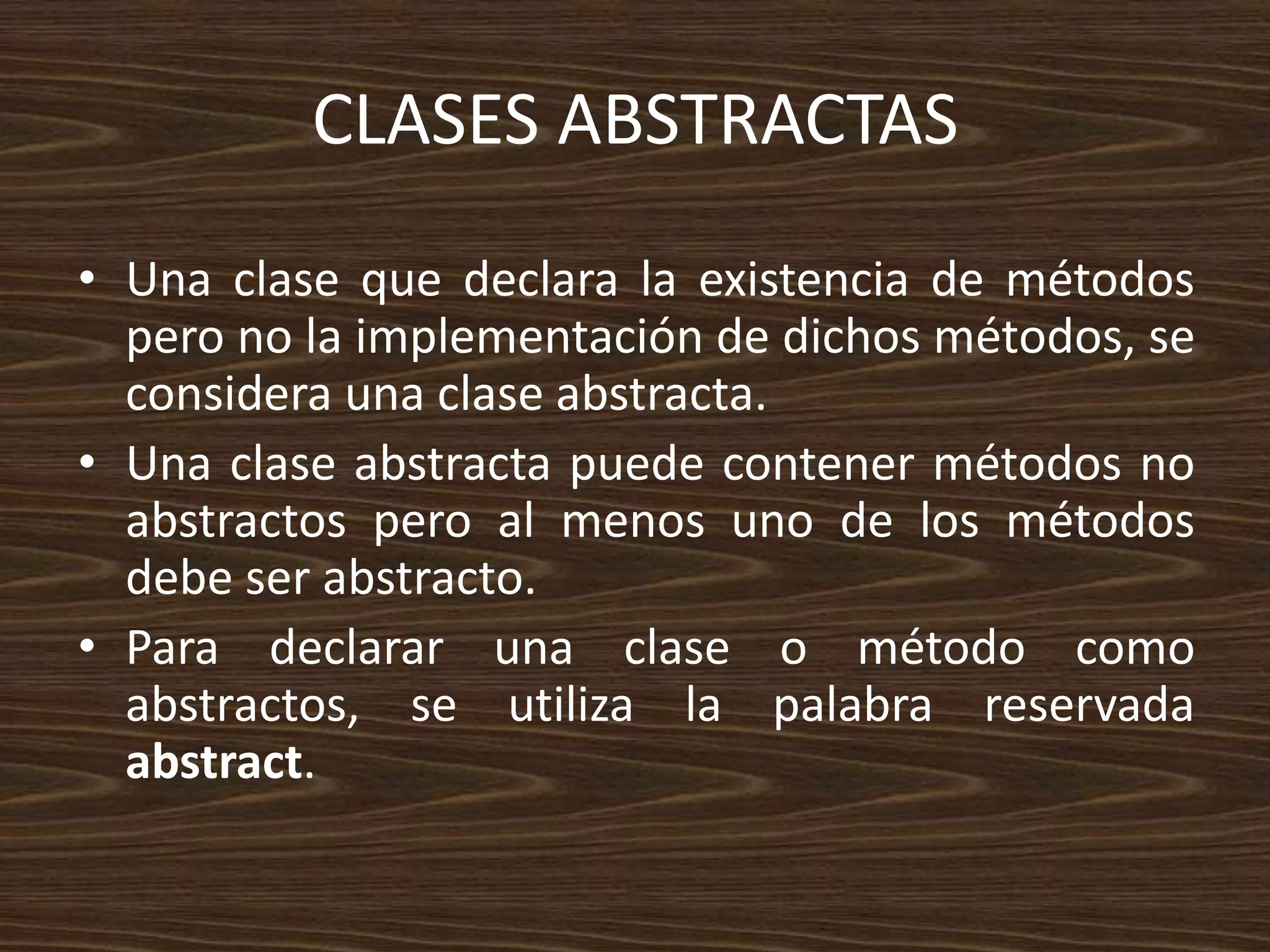 El documento explica las clases abstractas e interfaces en Java. Indica que una clase abstracta declara métodos pero no los implementa, y al menos uno debe ser abstracto. Las clases hijas implementan los métodos abstractos. Las interfaces también son clases abstractas cuyos métodos son todos abstractos, y las clases los implementan. El documento provee ejemplos de una clase Figura abstracta y una interfaz Animal.
