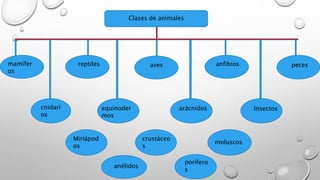 Este documento presenta las principales clases de animales, incluyendo mamíferos, aves, reptiles, anfibios, peces, cnidarios, equinodermos, arácnidos, insectos, anélidos, miriápodos, crustáceos, moluscos y poríferos. Para cada clase, provee una breve descripción de sus características distintivas.