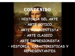Este documento presenta un resumen de la historia del arte divido en diferentes períodos: arte gótico, renacentista, clásico e impresionista. Describe las características y algunos representantes más importantes de cada uno de estos períodos artísticos.