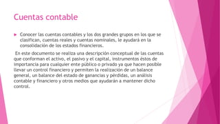 Este documento describe las diferentes clases de cuentas contables, incluyendo cuentas de activo, pasivo, capital, ingresos, gastos, costos de ventas, costos de producción, cuentas de orden deudoras y acreedoras. También explica que las cuentas se clasifican en cuentas reales, nominales y mixtas, y proporciona ejemplos de cada tipo. El propósito de clasificar las cuentas es permitir un control financiero y la preparación de estados financieros.