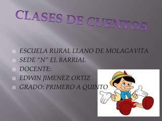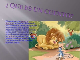 Este documento describe diferentes tipos de cuentos, incluyendo cuentos tradicionales, cuentos de hadas, cuentos fantásticos, cuentos policiales, ciencia ficción y cuentos de terror. Explica que los cuentos tradicionales son de autor anónimo y transmisión oral, mientras que los cuentos literarios son de autor conocido. También distingue entre cuentos basados en hechos posibles y cuentos sobre eventos imposibles o sobrenaturales.
