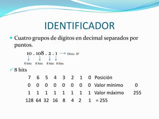 Las direcciones IP identifican de forma única a hosts en una red. Están formadas por 4 grupos de números separados por puntos. Las clases de IP (A, B y C) definen el rango de direcciones y cuántos octetos identifican a la red frente a la host. Clase A tiene el octeto inicial para la red, clase B los dos iniciales y clase C los tres iniciales.