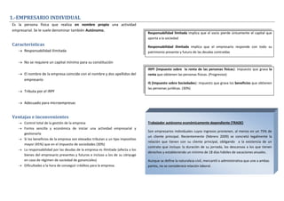 Las empresas se clasifican según varios criterios como su naturaleza, rama de actividad, tamaño y naturaleza jurídica. Las empresas también se clasifican como privadas o públicas dependiendo de quién posee el capital de la empresa. El empresario individual es una forma común de empresa donde una persona física realiza una actividad empresarial en su propio nombre y asume responsabilidad ilimitada por las deudas de la empresa.