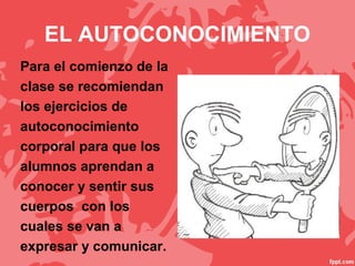 El documento proporciona recomendaciones para la enseñanza de expresión corporal, sugiriendo ejercicios de autoconocimiento al comienzo de la clase, el uso de música que invite a la participación, ejercicios inicialmente guiados que se vuelvan más abiertos con el tiempo, el uso de objetos para facilitar la improvisación, y comentar las experiencias de los estudiantes para ponerles palabras.