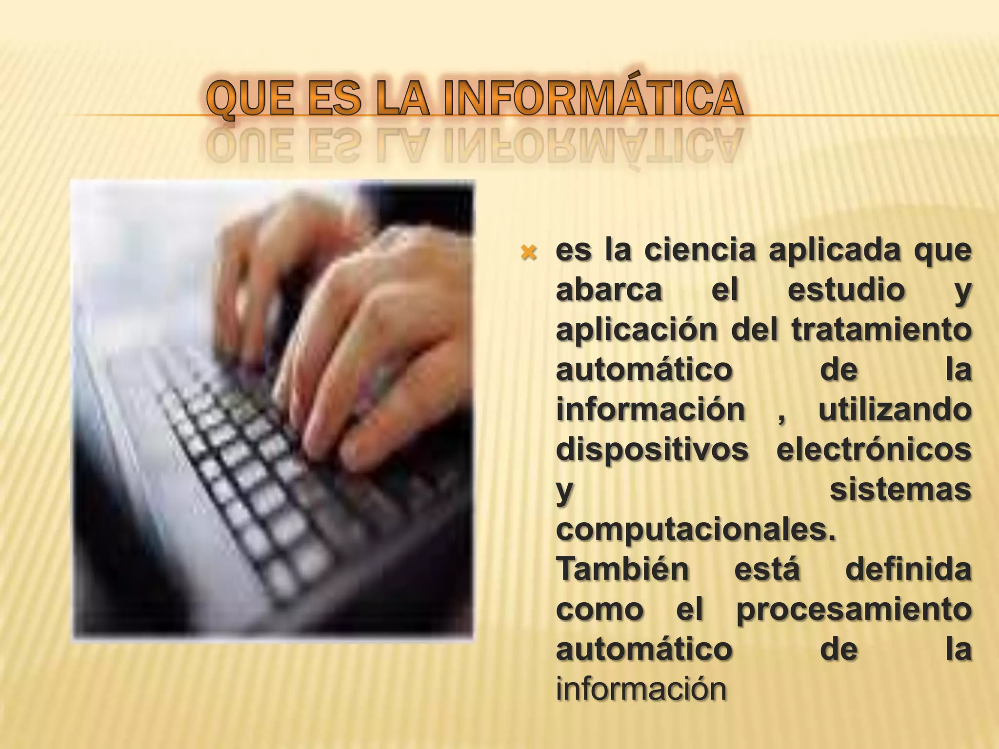La informática es la ciencia que estudia el tratamiento automático de la información utilizando dispositivos electrónicos y sistemas computacionales. Sirve para facilitar trabajos repetitivos, reducir costos y aumentar la producción. Los sistemas informáticos captan información digital, la procesan y transmiten resultados. La informática se aplica a áreas como gestión empresarial, almacenamiento de datos, robótica y más.