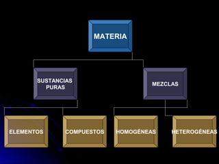Este documento describe los diferentes tipos de sustancias y mezclas, así como los métodos para separar mezclas. Las sustancias se dividen en puras (elementos y compuestos) y mezclas (homogéneas y heterogéneas). Las mezclas se pueden separar usando procesos mecánicos, físicos, de disolución o químicos como la precipitación.