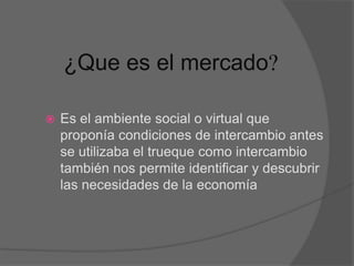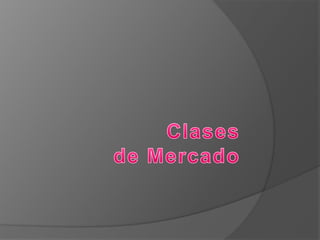 El documento describe los diferentes tipos de mercados. Explica que un mercado es el ambiente donde ocurren intercambios económicos y que existen mercados de competencia perfecta e imperfecta. También describe los mercados financieros, de capitales, de valores, bilaterales, grises y los clasifica según su alcance geográfico.
