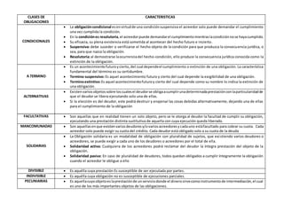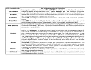 Este documento describe las diferentes clases de obligaciones según su naturaleza y características. Describe obligaciones condicionales, a término, alternativas, facultativas, mancomunadas, solidarias, divisibles, indivisibles y pecuniarias. Además, incluye ejemplos y la base legal de cada tipo de obligación en el Código Civil Venezolano.
