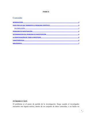 Este documento describe los métodos de investigación y las clases de problemas. Explica que un problema surge cuando hay una laguna teórica o un hecho no explicado por una teoría. Luego detalla las 5 fases por las que pasa un problema científico: génesis, caracterización, diseño, transformación y explicación. También cubre cómo determinar el problema de investigación, identificar el tema a investigar y sus características.