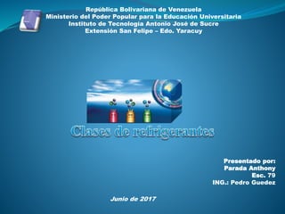 Este documento trata sobre los refrigerantes y sus efectos ambientales. Explica los diferentes tipos de refrigerantes como CFC, HCFC y HFC y sus propiedades. También describe las aplicaciones de la refrigeración y la importancia de recuperar y reciclar los refrigerantes para evitar emisiones dañinas. Finalmente, concluye que los refrigerantes son vitales pero algunos son nocivos para la capa de ozono, por lo que es importante sustituirlos por alternativas más ecológicas.