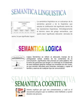 La semántica lingüística estudia la codificación del significado en expresiones lingüísticas. La lógica semántica se refiere al manejo de la ambigüedad verbal y al análisis de contenidos para captar significados precisos. La comunicación intenta explicar por qué nos comunicamos y el mecanismo psíquico entre hablante y oyente durante el proceso.