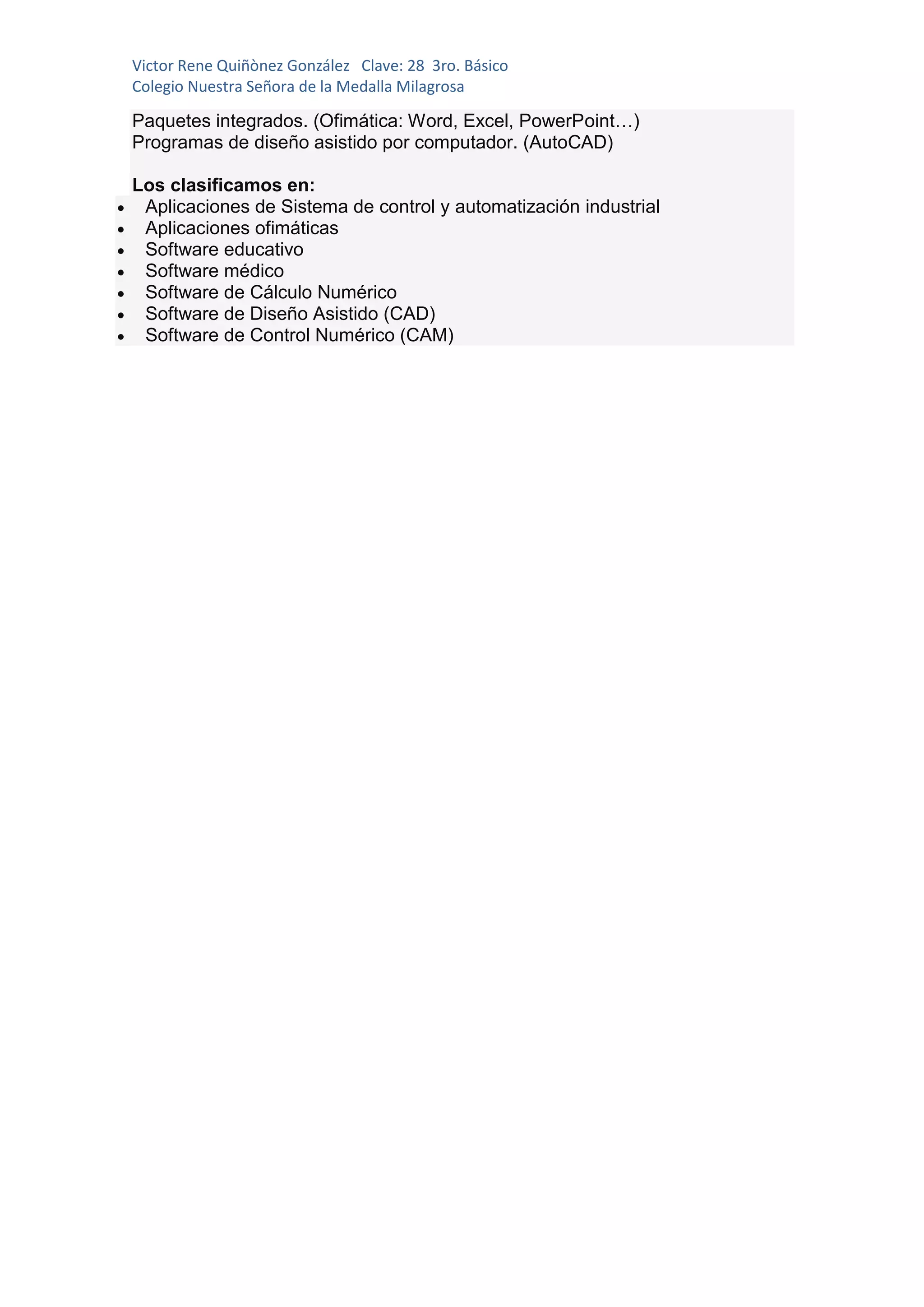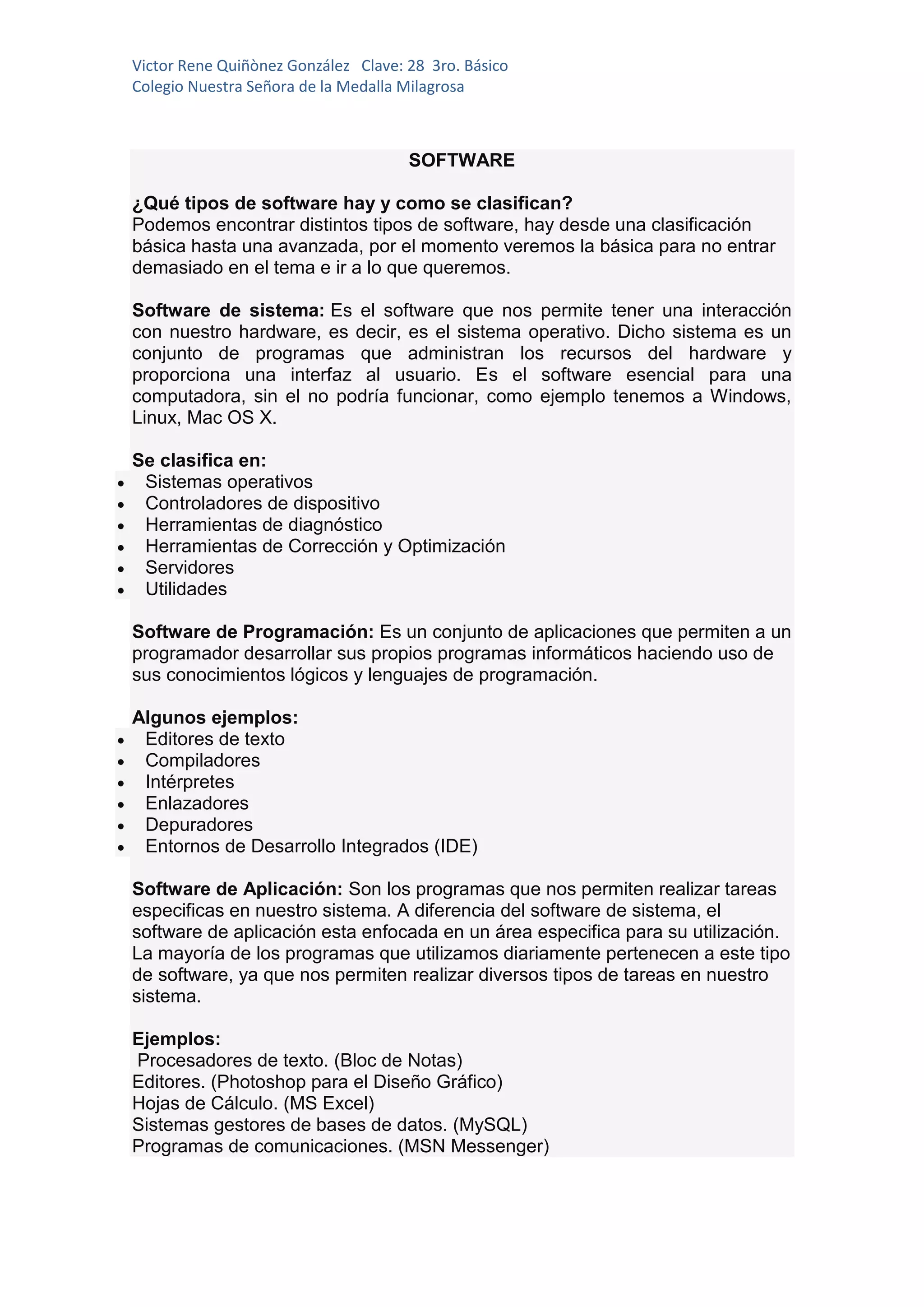 Este documento clasifica los principales tipos de software. Describe el software de sistema, que incluye sistemas operativos y controladores de dispositivos, y permite la interacción con el hardware. También cubre el software de programación, como editores de texto y compiladores, que permite a los programadores crear software. Además, explica el software de aplicación, como procesadores de texto y hojas de cálculo, que permite a los usuarios realizar tareas específicas.