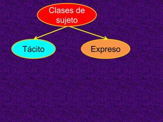 Este documento clasifica los sujetos en tácitos y expresos. Los sujetos tácitos no aparecen explícitamente en la oración pero se sobreentienden, mientras que los sujetos expresos sí aparecen. Proporciona ejemplos de cada tipo de sujeto y recuerda que el núcleo del sujeto siempre es un sustantivo o pronombre. Finalmente, pide identificar el tipo de sujeto en varias oraciones ejemplo.