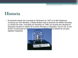 El documento resume las características y aplicaciones de varios tipos de transistores, incluyendo el transistor bipolar inventado en 1947, el transistor de efecto de campo (MOSFET) ampliamente utilizado hoy en día, el transistor de puerta aislada bipolar (IGBT) utilizado en electrónica de potencia, y el transistor uniunión (UJT) utilizado para conmutación.