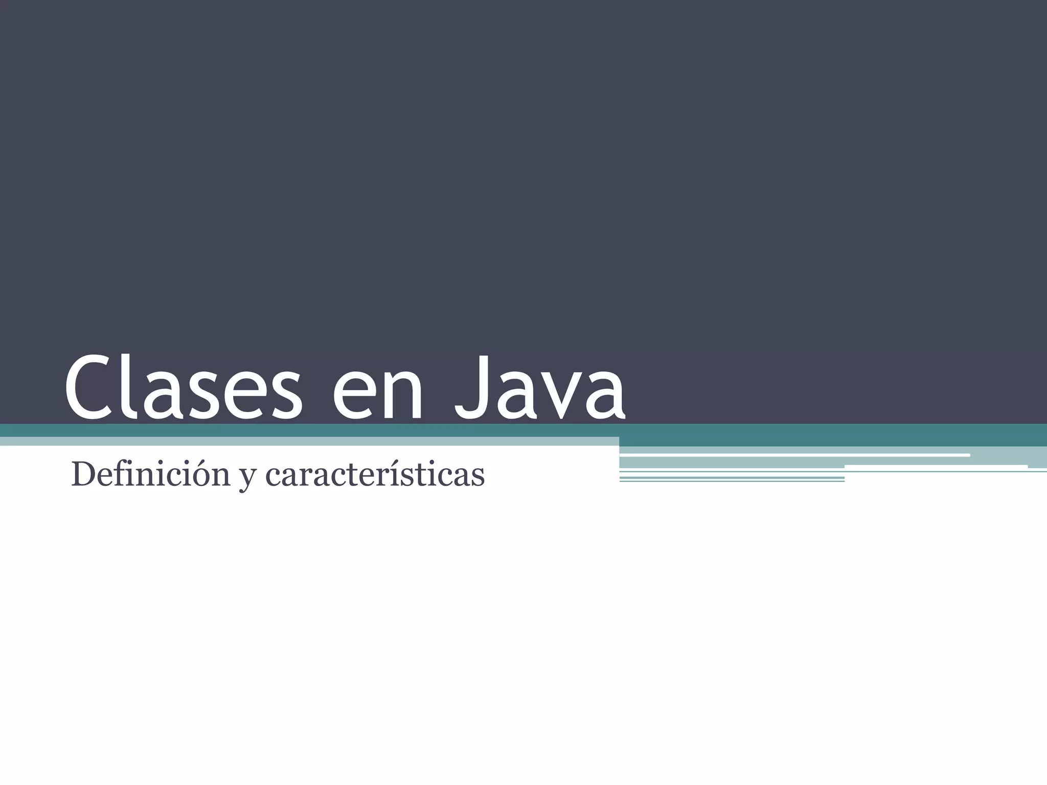 Una clase en Java representa un conjunto de objetos que comparten una estructura y comportamiento comunes. Las clases incluyen atributos que definen el estado de los objetos y métodos que definen su comportamiento. Las clases se pueden organizar en una jerarquía de herencia donde las subclases heredan atributos y métodos de las superclases.