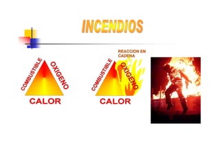 Este documento describe los conceptos básicos del fuego, incluyendo los factores necesarios (combustible, comburente y calor), las clases de fuego según la clasificación americana (A, B, C, D), los peligros que representa para las personas, las formas en que se transmite el calor (conducción, convección y radiación), los tipos de extintores y sus usos, y recomendaciones para la prevención de incendios.