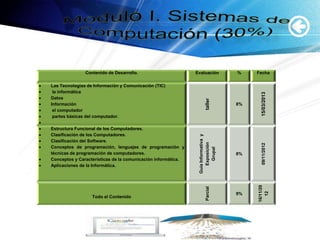 Este documento presenta la información sobre un taller sobre tecnologías de información y comunicación (TIC) dictado por el ingeniero Naybi Mirabal. El taller cubrirá temas como informática, partes del computador, clasificación de computadores, software, programación, comunicación informática y aplicaciones de la informática. El taller consta de varias sesiones evaluadas y se llevará a cabo entre marzo y noviembre de 2013.