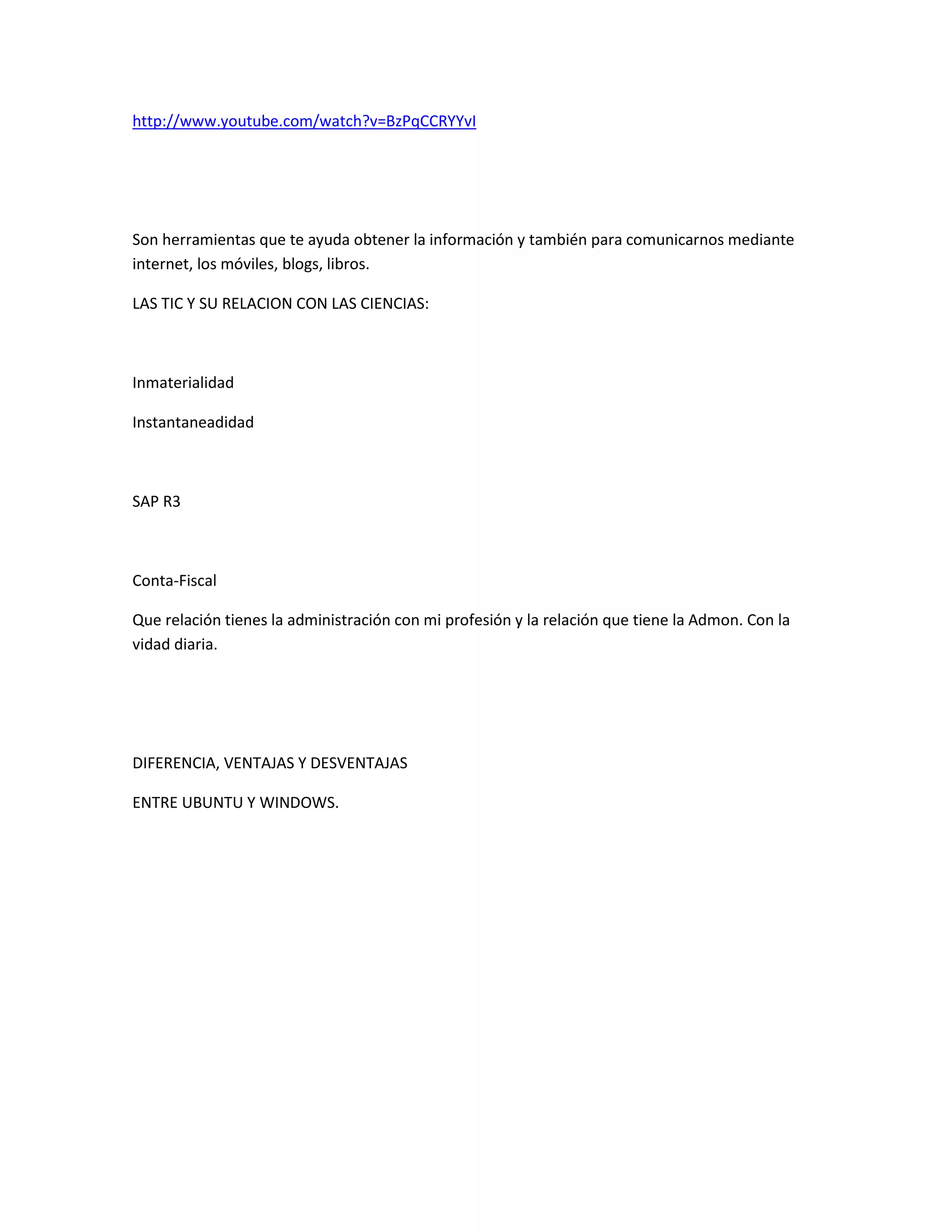 Este documento discute brevemente las herramientas tecnológicas como Internet, teléfonos móviles y blogs que ayudan a obtener información y comunicarse. También menciona la relación entre las tecnologías de la información y la comunicación (TIC) y las ciencias, así como las diferencias y ventajas/desventajas entre los sistemas operativos Ubuntu y Windows.