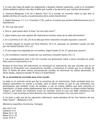 El documento discute la definición bíblica del matrimonio. Según Génesis 2:18-25, Dios instituyó el matrimonio para que el hombre y la mujer se unan. Génesis 2:24 establece tres aspectos esenciales del matrimonio: dejar a los padres para unirse en una sola carne con su cónyuge. La boda es el evento público que hace concreto el matrimonio y marca el momento en que la pareja puede tener relaciones sexuales.