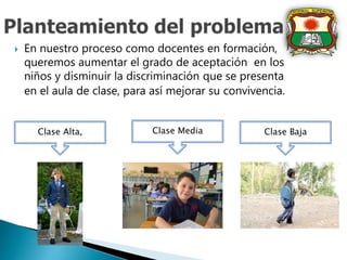Este documento describe un proyecto para reducir la discriminación basada en clases sociales entre estudiantes de tercer y cuarto grado en una escuela. El proyecto involucró aplicar estrategias pedagógicas grupales e individuales para mejorar la aceptación y reconocimiento entre los estudiantes. Los resultados mostraron que este enfoque ayudó a disminuir la discriminación socioeconómica en el aula.