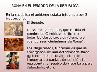 1) La sociedad romana estaba dividida en patricios (nobles) y plebeyos (clase baja), lo que generaba conflictos sociales.