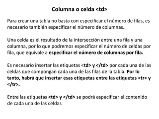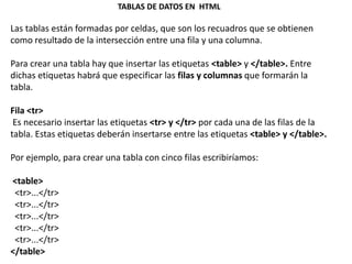 Las tablas en HTML están formadas por celdas que se crean mediante la intersección de filas y columnas. Se definen tablas usando las etiquetas <table> y </table> y se añaden filas con <tr> y </tr> y celdas con <td> o encabezados de columna con <th>. Las tablas pueden personalizarse usando atributos como width, height, bordercolor y bgcolor.