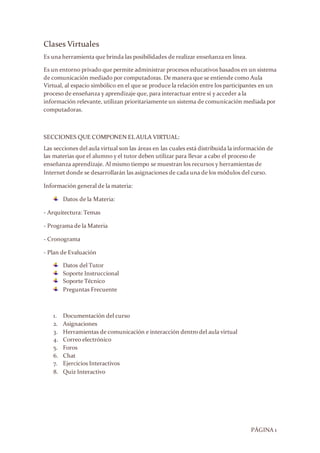 El documento describe las clases virtuales, que permiten la enseñanza en línea a través de un sistema de comunicación mediado por computadoras. Las clases virtuales tienen secciones que contienen información sobre las materias, como temas, programas, cronogramas y planes de evaluación, así como datos del tutor, soporte instructivo y técnico, y preguntas frecuentes. También incluyen herramientas de comunicación e interacción como correo electrónico, foros, chat, ejercicios y quiz interactivos.