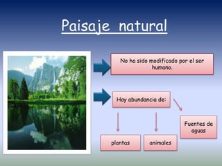 El documento describe cuatro tipos de paisajes: paisaje natural, paisaje cultural, paisaje rural y paisaje urbano. El paisaje natural no ha sido modificado por el ser humano y contiene abundantes plantas, animales y fuentes de agua. El paisaje cultural ha sido alterado por la acción humana a medida que crece la población. El paisaje rural está formado por extensas zonas de tierra organizadas para la agricultura y ganadería, con casas distantes unidas por caminos. El paisaje urbano contiene