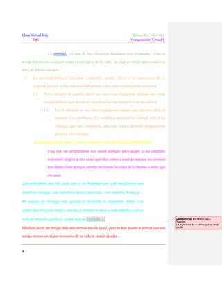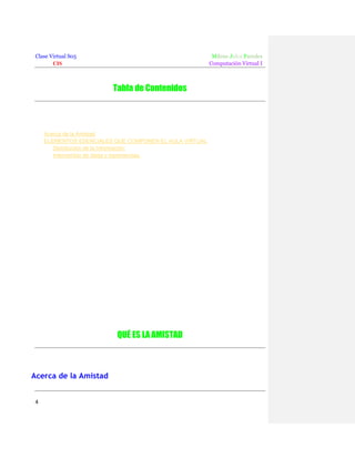 Este documento describe los elementos esenciales de un aula virtual efectiva. Explica que un aula virtual debe permitir la distribución de materiales en línea y hacerlos accesibles a los estudiantes. Además, debe proporcionar mecanismos para el intercambio de ideas entre estudiantes y entre estudiantes y profesores, como foros de discusión. Los foros de discusión permiten la interacción que enriquece el aprendizaje más allá de los contenidos iniciales planeados por el profesor.