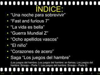 El documento presenta resúmenes de 8 películas y la saga de Los Juegos del Hambre, que consta de 4 películas. Para cada entrada incluye el reparto y una breve sinopsis. Las películas resumidas son Una noche para sobrevivir, Fast and furious 7, La vida es bella, Guerra Mundial Z, Ocho apellidos vascos, El niño, Corazones de acero y la saga Los juegos del hambre.