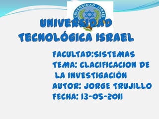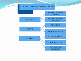 Este documento clasifica y describe los diferentes tipos de investigación. Identifica investigación primaria y secundaria, exploratoria, descriptiva, explicativa, correlacional, experimental, cuantitativa y cualitativa. Explica que la investigación puede ser teórica o aplicada, y puede utilizar métodos como observación, experimentación o encuestas. Además, distingue entre fuentes primarias y secundarias de información.