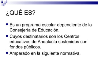 Este documento describe el Programa Clásicos Escolares de la Consejería de Educación de Andalucía, cuyo objetivo es fomentar la lectura y el uso de la biblioteca entre los estudiantes. Se basa en la normativa educativa española y andaluza. El programa se implementa de forma voluntaria en los centros educativos andaluces a través de la lectura y discusión de obras clásicas. El IES Turóbriga de Aroche ha participado leyendo y analizando obras como El Abencerraje y la