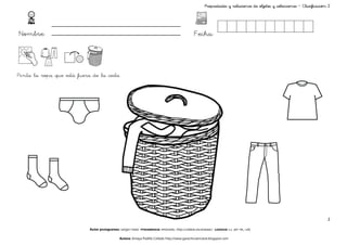 Este documento contiene una serie de instrucciones visuales para clasificar y organizar objetos basadas en sus propiedades y relaciones. Cada instrucción presenta una imagen con varios objetos y pide al estudiante que pinte, pegue o tache los objetos que cumplen cierta condición, como estar fuera de un contenedor o ser más largos que otros.